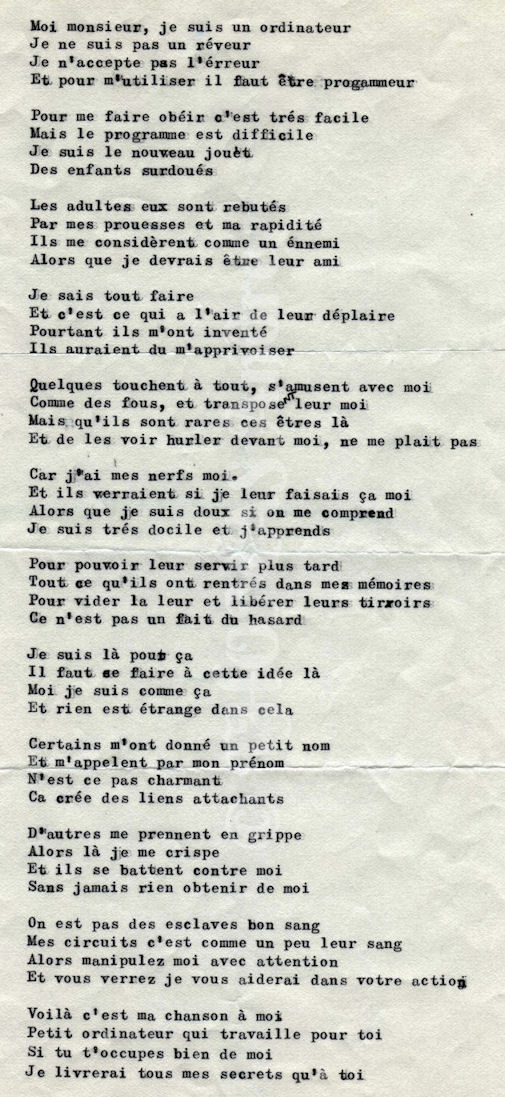 Ne connaissant pas de musicien à l’époque, j'ai laissé dormir ces paroles. Mais aujourd’hui, avec Internet, un musicien aimant mes textes pourrait créer un musique et en faire une chanson. C’est pour cela que je mets mes paroles en lignes. Pour leur trouver une musique, quitte à modifier un peu les textes pour que l’harmonie musicale soit respectée.