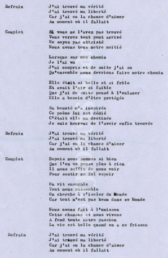 Ne connaissant pas de musicien à l’époque, j'ai laissé dormir ces paroles. Mais aujourd’hui, avec Internet, un musicien aimant mes textes pourrait créer un musique et en faire une chanson. C’est pour cela que je mets mes paroles en lignes. Pour leur trouver une musique, quitte à modifier un peu les textes pour que l’harmonie musicale soit respectée.