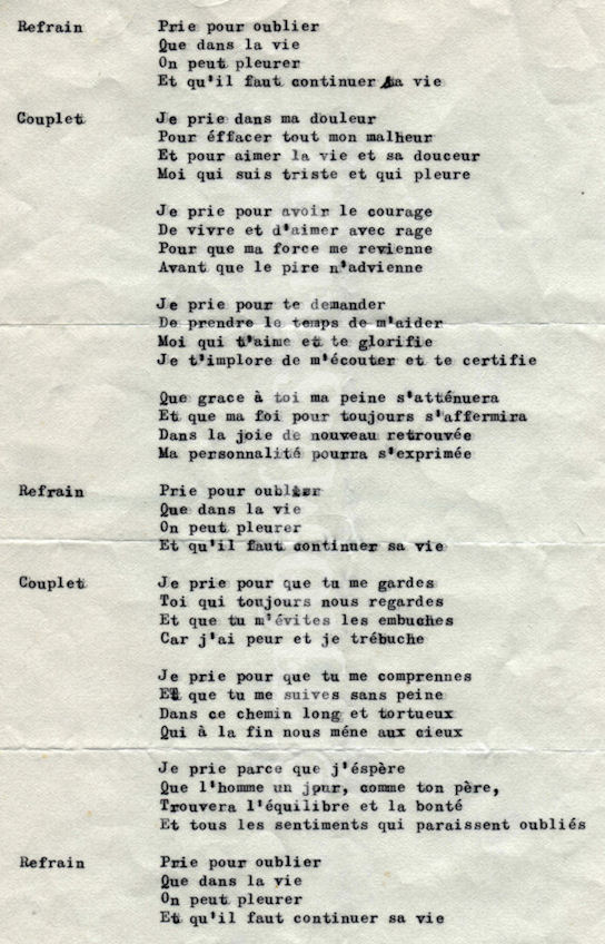 Ne connaissant pas de musicien à l’époque, j'ai laissé dormir ces paroles. Mais aujourd’hui, avec Internet, un musicien aimant mes textes pourrait créer un musique et en faire une chanson. C’est pour cela que je mets mes paroles en lignes. Pour leur trouver une musique, quitte à modifier un peu les textes pour que l’harmonie musicale soit respectée.